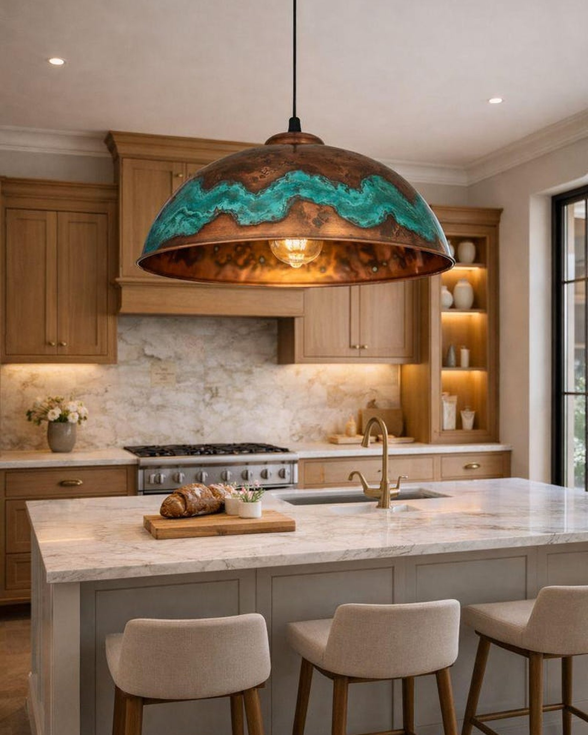 Handgefertigte Gealterte Kupfer Dome Pendelleuchte – Vintage Patina, Kücheninsel & Esstisch