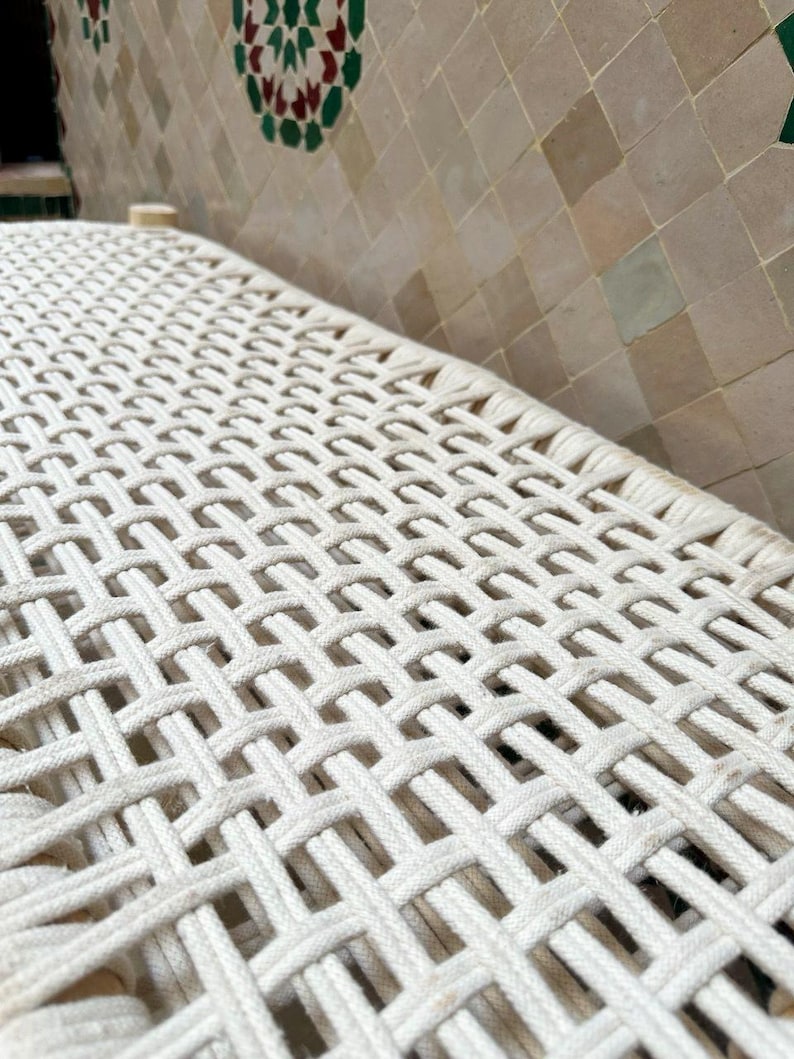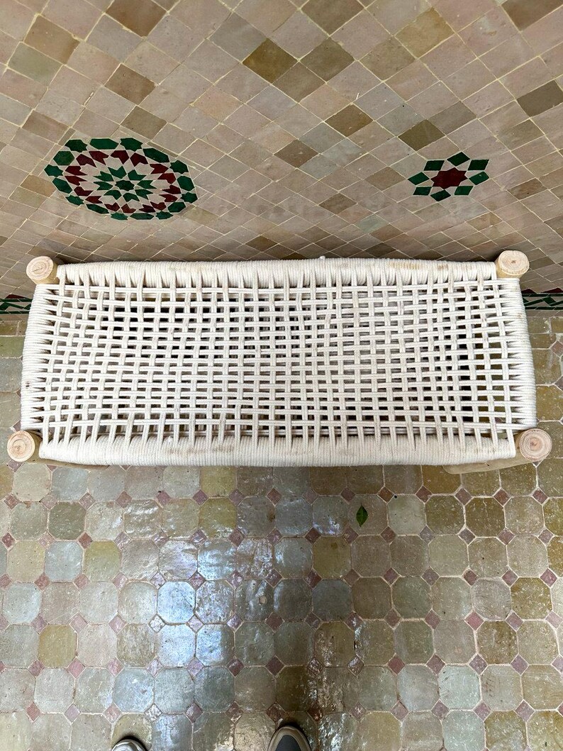 Diese wunderschön handgeflochtene marokkanische Bank ist ein vielseitiges und elegantes Möbelstück, das jedem Raum Charakter verleiht. Mit weißem Seil geflochten und mit viel Liebe zum Detail gefertigt, eignet sie sich perfekt für den Flur, als zusätzliche Sitzgelegenheit im Wohnzimmer, als dekorativer Akzent oder am Fußende des Bettes. Der frische Boho-Chic-Look wirkt modern und zeitlos zugleich.