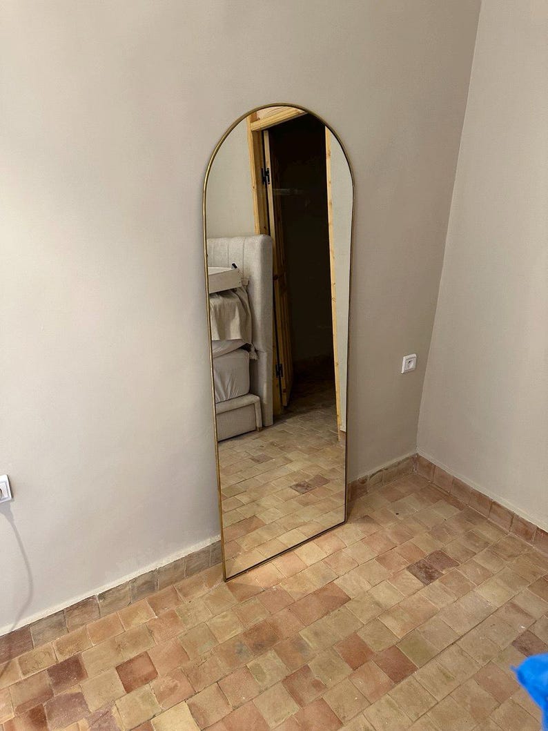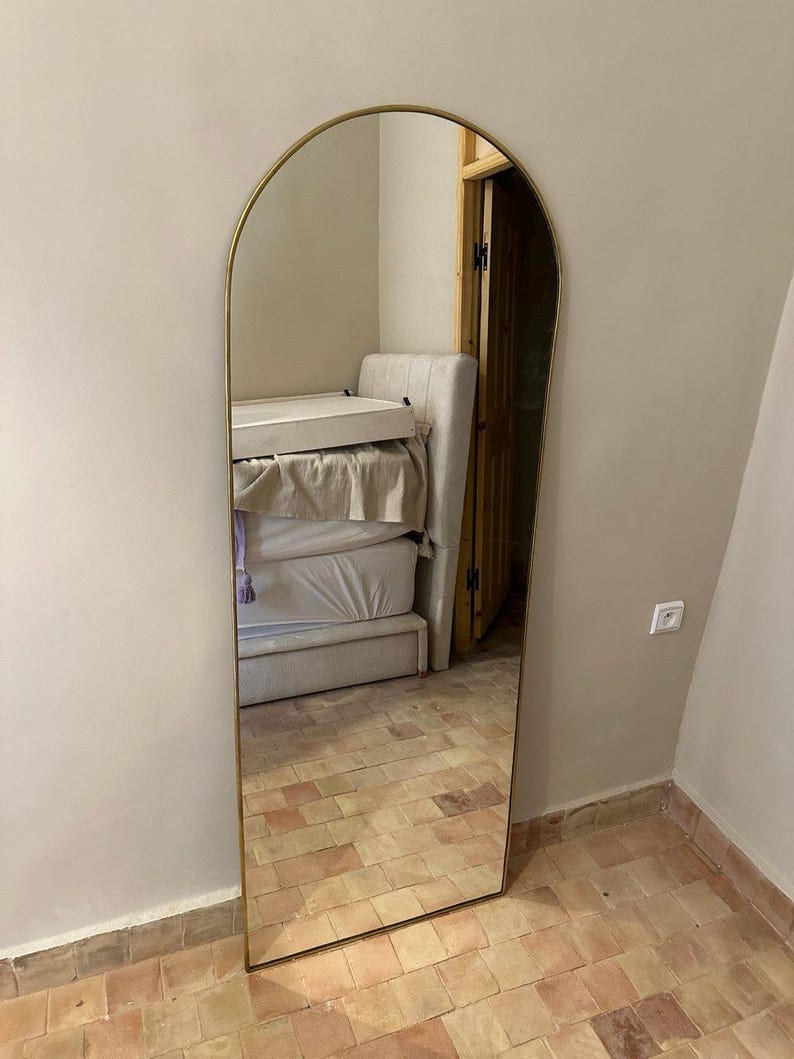 Verleihe deinem Zuhause architektonischen Charakter mit diesem marokkanischen handgefertigten Wandspiegel aus Messing in eleganter Türform. Von Kunsthandwerkern gefertigt, bringt die warme Messingoberfläche zeitlose Eleganz und visuelle Tiefe.
