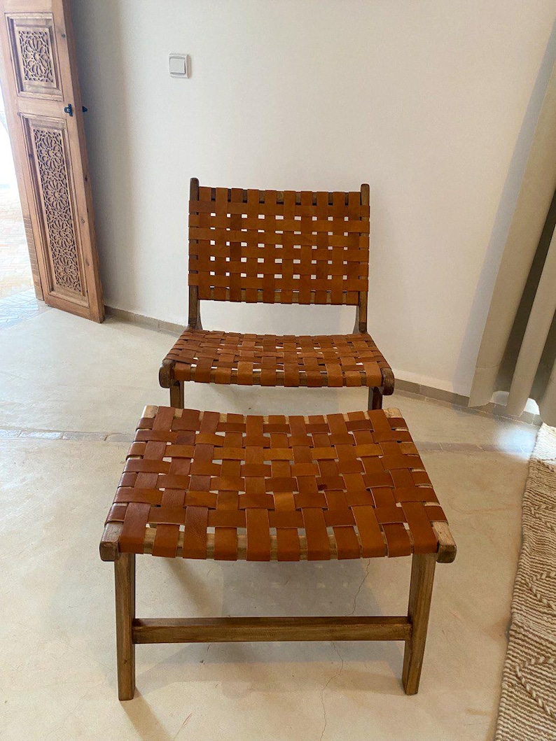 Erlebe die Schönheit traditioneller marokkanischer Handwerkskunst mit diesem marokkanischen Nussbaum-Sessel & Fußhocker-Set mit Leder. Handgefertigt aus massivem Nussbaumholz und mit hochwertigem Leder geflochten, verbindet dieses Set natürliche Eleganz mit außergewöhnlichem Komfort.