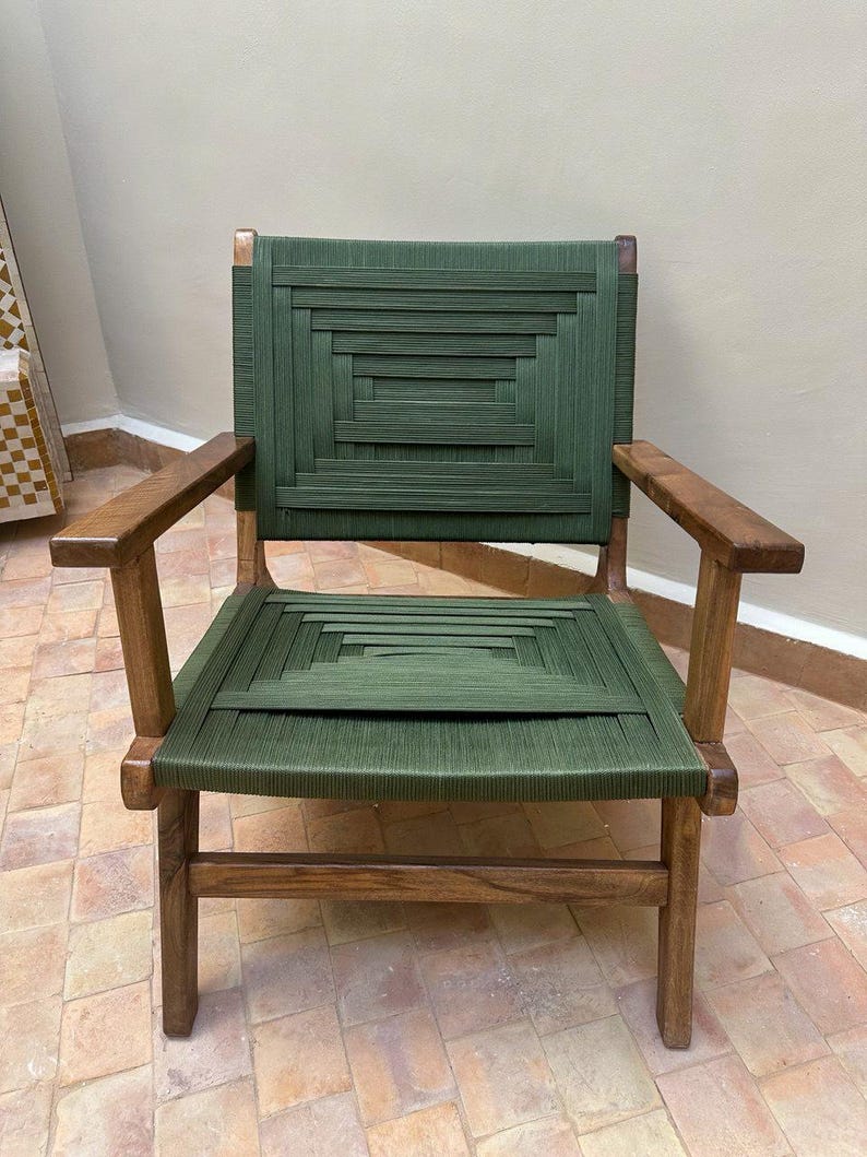 Bringen Sie marokkanische Authentizität in Ihr Zuhause mit diesem wunderschön handgefertigten Sessel aus massivem Nussbaumholz, von Hand mit natürlicher grüner Kordel geflochten. Das Design verbindet traditionelle Handwerkskunst mit einem modernen, minimalistischen Look – stilvoll und bequem zugleich.