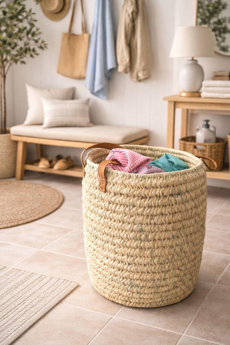 Runder geflochtener Wäschekorb mit Ledergriffen – natürliche Aufbewahrung
