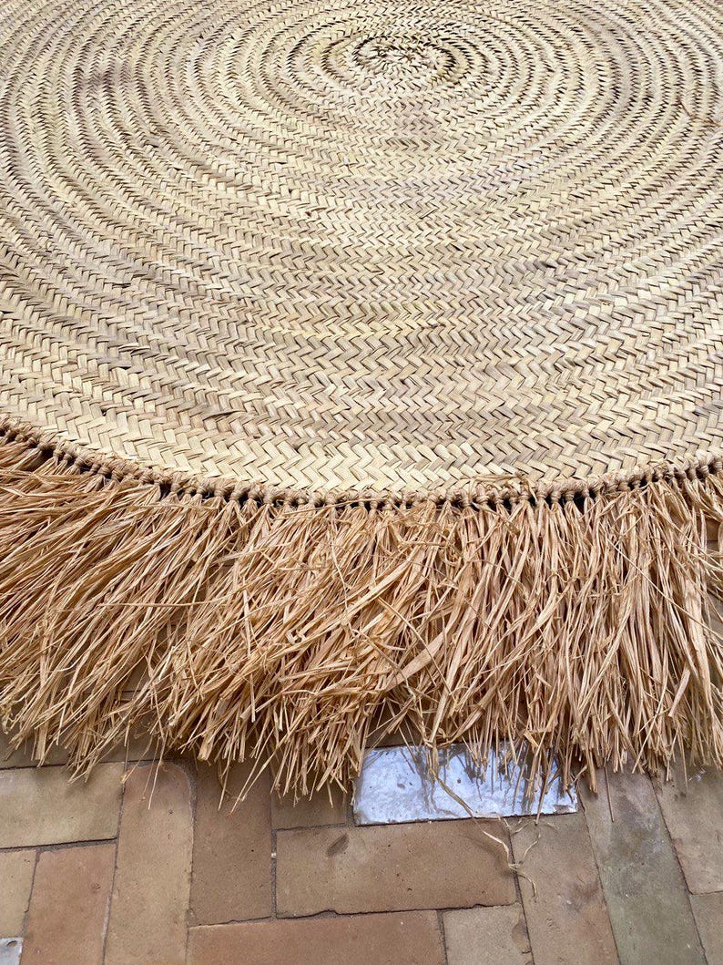 Bringen Sie natürliche Wärme und handgefertigte Schönheit in Ihr Zuhause mit unserem handgeflochtenen Raffia-Teppich, sorgfältig von erfahrenen marokkanischen Kunsthandwerkern gefertigt. Aus hochwertigen Natur-Palmfasern hergestellt, sorgt dieser Teppich für Struktur, Charme und eine erdige Boho-Ästhetik – perfekt für Wohnzimmer, Schlafzimmer, Flur oder den überdachten Außenbereich.