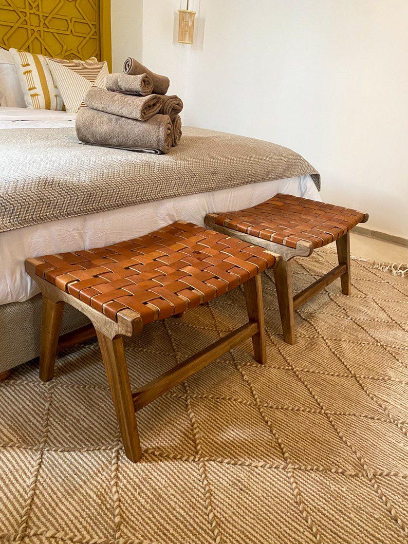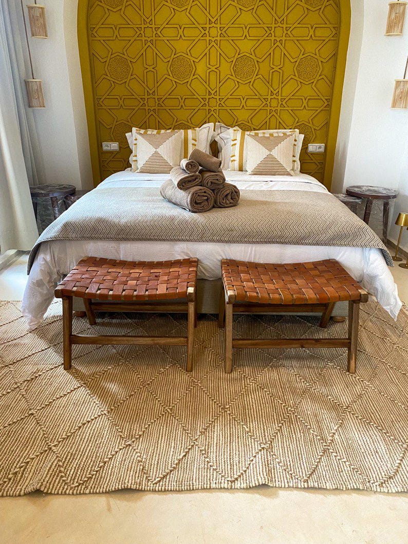 Verleihe deinem Interior ein stilvolles Upgrade mit diesem Set aus 2 handgefertigten marokkanischen Bänken aus edlem Walnussholz, geflochten mit hochwertigem Naturleder. Diese Bänke verbinden traditionelle Handwerkskunst mit einem eleganten, modernen Look und sind zugleich dekorativ und funktional.