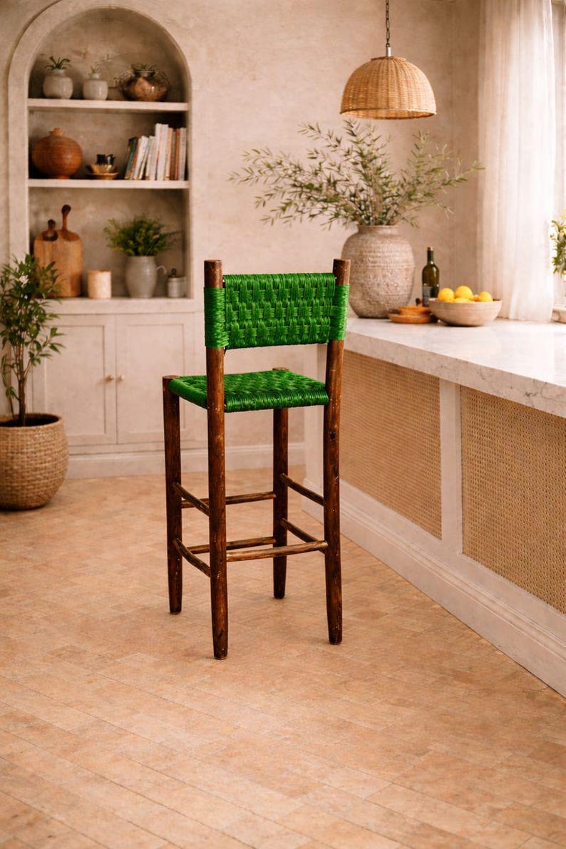 Bringe Farbe und Handwerkskunst in deinen Raum mit diesen marokkanischen Boho-Barhockern, handgefertigt aus massivem Holz und mit einer wunderschönen grünen Seilflechtung veredelt. Die Kombination aus natürlichen Materialien und lebendigen Akzenten sorgt für einen frischen, authentischen Look – inspiriert von traditioneller marokkanischer Artisan-Arbeit.