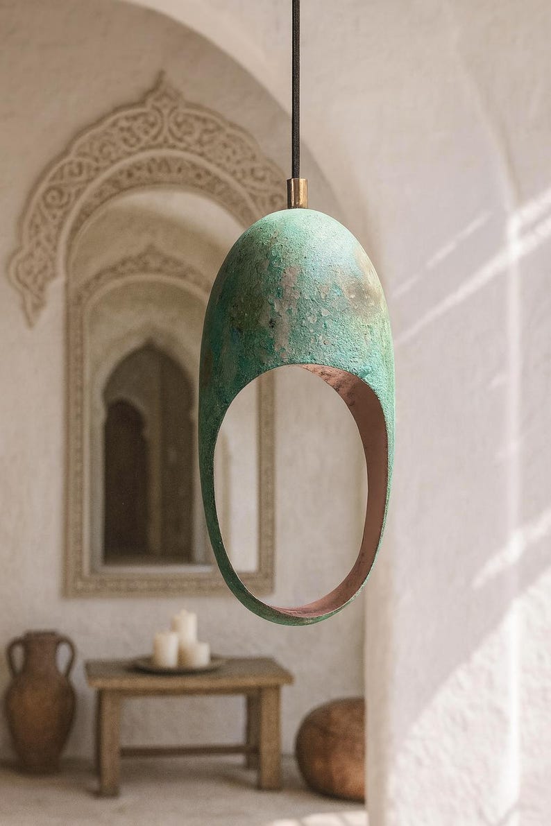 Türkise Patina Kupfer-Pendelleuchte – Moderne Artisan Hängelampe