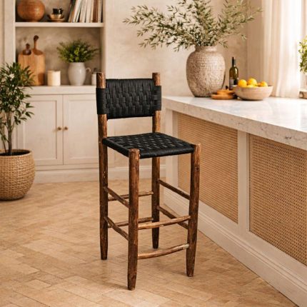 Set marokkanischer Boho-Barhocker mit schwarzem Seil – handgefertigt