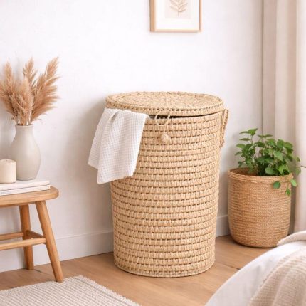 Runder handgeflochtener Palmblatt Wäschekorb – Boho Aufbewahrung