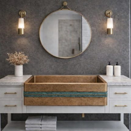 Rustikales Kupferwaschbecken mit Frontschürze – Gehämmerte Schale mit Blauem Band