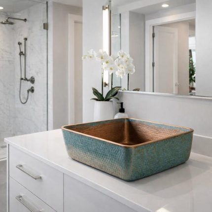 Türkise Patina Quadratische Kupfer Aufsatzschale – Gehämmerte Waschbecken-Basin