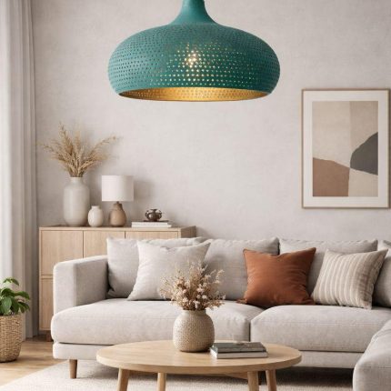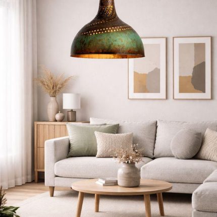 Gehämmerte Messing Pendelleuchte mit Türkis Patina – Artisan Statement Lampe