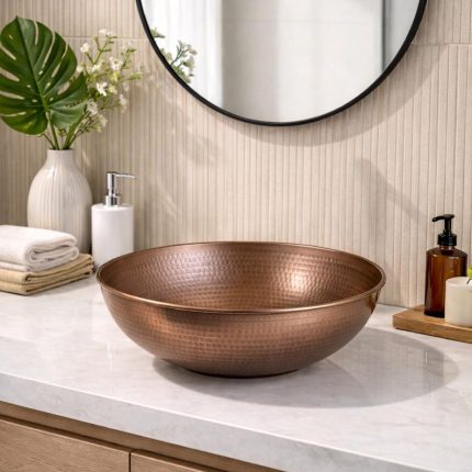 Gehämmertes Kupfer Rundes Aufsatzwaschbecken – Rustikale Waschschale fürs Bad