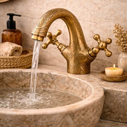 Gravierter Messing-Waschtischarmatur – Zwei Kreuzgriffe, Vintage Deck-Mount Wasserhahn